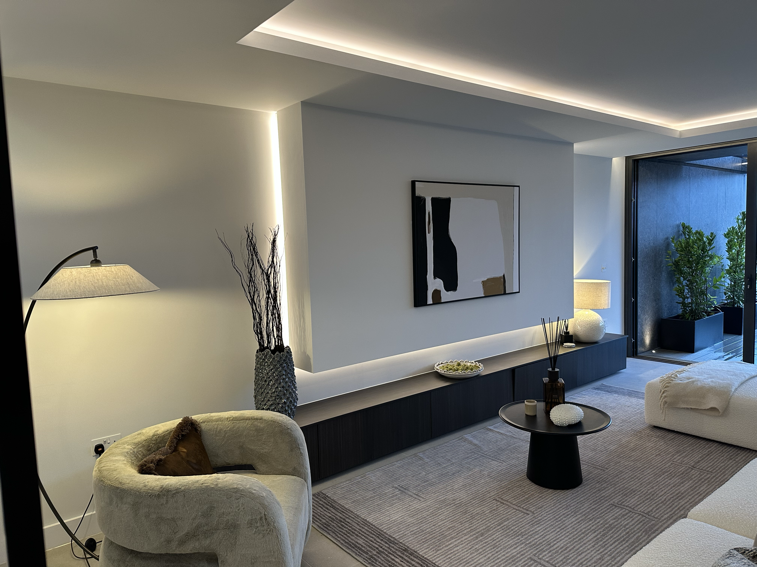 We created an Architectural Modern media wall centred on proportion, surface and light rather than visible cabinetry. Clean geometry and integrated lighting establish a restrained, minimalist focal point, resulting in a fully concealed and visually seamless installation.